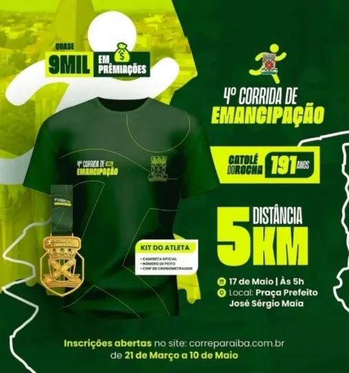CORRIDA EM CATOLÉ 4ª Corrida da Emancipação Política de Catolé do Rocha será realizada dia 17 de maio; inscrições estão abertas